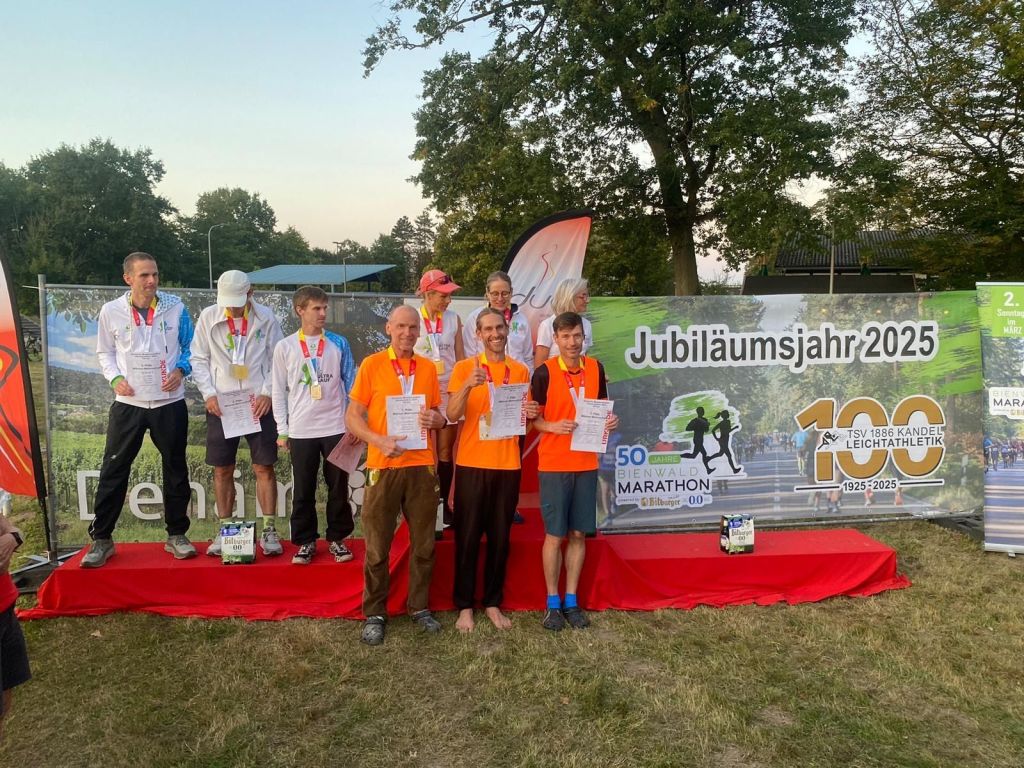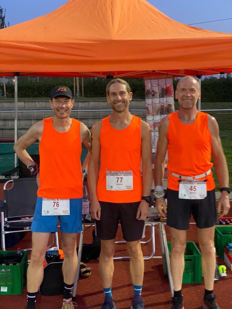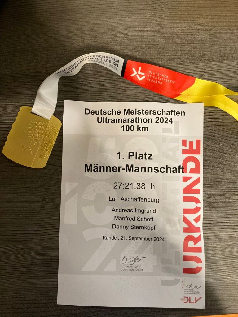 „Träume werden wahr !! Am letzten Samstag fand in Kandel die Deutsche Meisterschaft im 100KM Lauf statt. Lange schon besprochen und wieder verworfen wurde kurz vor Ende der Anmeldefrist in Andis Sauna doch nochmal philosophiert, wie wäre es denn mit einer Mannschaft den Meistertitel zu holen. Daraus wurde ein Krimi, denn irgendwie waren fast alle aus dem großen Kader der LuT Ultraläufer verhindert ect. Aber der Gedanke war da und als Georg für Andi die Betreuung der kleinen Nachwuchsathleten des LuT übernahm, wurde in letzter Minute mit Andi der 3 Mann gemeldet. Hurra!! Gemeldet waren in Kandel laut Teilnehmerliste 6 Mannschaften und eine davon mit 7 Läufern. Da diese ihr Verpflegungszelt mitsamt weit angereisten Supporten direkt neben uns errichteten, war der Kampf David gegen Goliath eröffnet 😃. Da 3 Läufer durchkommen mussten, gab es für uns nur eines, egal wie durchhalten. Bei diesem Lauf-Format kann allerdings schon eine Kleinigkeit das Aus sein und es wurde auch immer heißer auf der Teils prall in der Sonne liegenden 5km Strecke. Also trotz allem Widrigkeiten hielten wir unser Ziel immer vor Augen und mit dem Motto If you can dream it, you can get it , ging es nun Runde für Runde vorwärts. Unser Plus an diesem Tag war Mateusz, unser best Supporter!!, der sich zwar ein Buch mitnahm, zwecks Langeweile, aber keine einzige Seite lesen konnte. Für uns hatte er den wichtigsten und besten Job gemacht. Was soll man sagen🤷, wir liefen alle persönliche Bestleistung und am Limit. Danny lief mit mir sehr lange zusammen und mit einer super Teamarbeit rollten wir stetig Platz um Platz nach vorne. Er verbesserte seine PB um ganze 8 Minuten trotz Hitze . Andi lief ein fuliminantes Rennen und holte sich direkt vor Danny noch den 3.Ak Platz. Trainingsrückstand und Krämpfe konnten ihn nicht stoppen. Meiner einer hatte auch noch keine Zeit auf dieser Distanz und war mit knapp über 9Std und dem 2. AK Platz mehr als zufrieden. Aber den absoluten Vogel haben wir abgeschossen mit dem gemeinsamen Sieg und dem Gewinn der Deutschen Meisterschaft der Mannschaft!!! Nix Senioren😃Hauptklasse !!! Nochmals vielen Dank von uns ….bei unseren verständnisvollen Frauen, bei Mateusz, bei Georg und allen die uns unterstützten und mit fieberten. Und eins noch ☝️Wir machens nie wieder 🤣🤣“